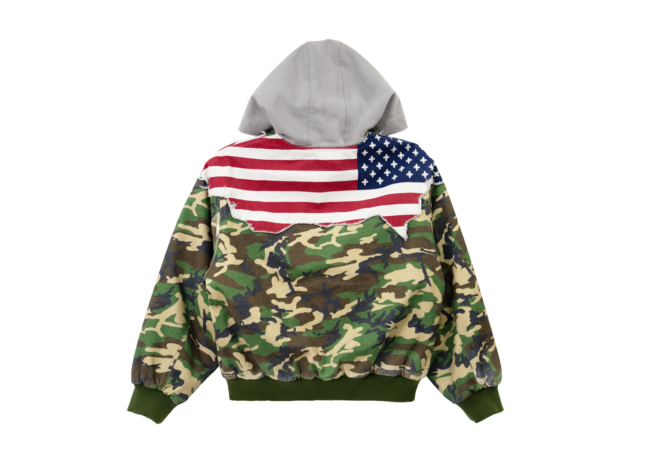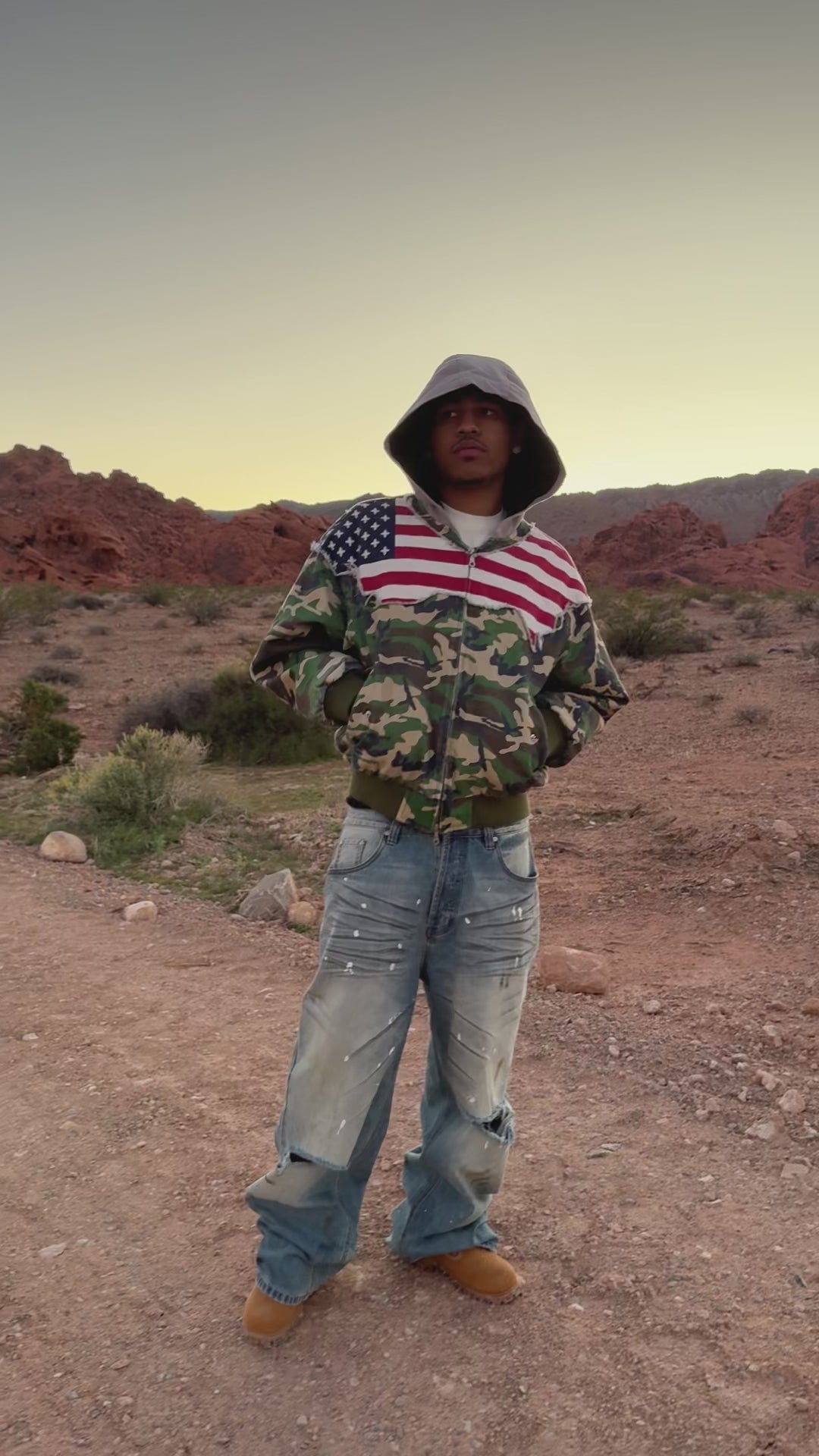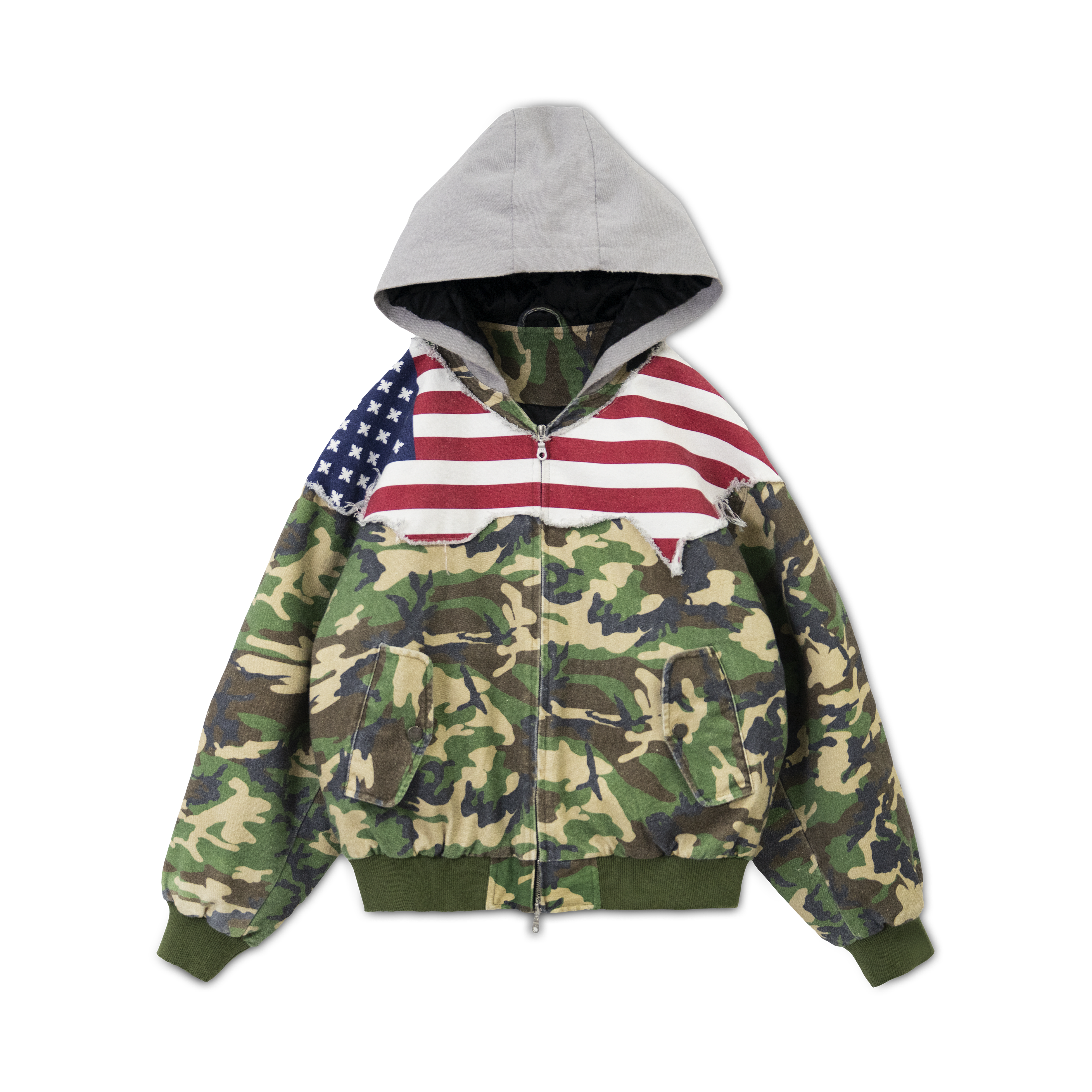 Rooted in heritage, built for the present. The God Kountry Bomber reimagines classic military design through a spiritual lens — featuring a vintage camouflage base with a deconstructed American flag panel across the shoulders. The contrast hood and quilted interior bring comfort to structure, while the cropped, boxy fit adds a modern edge.