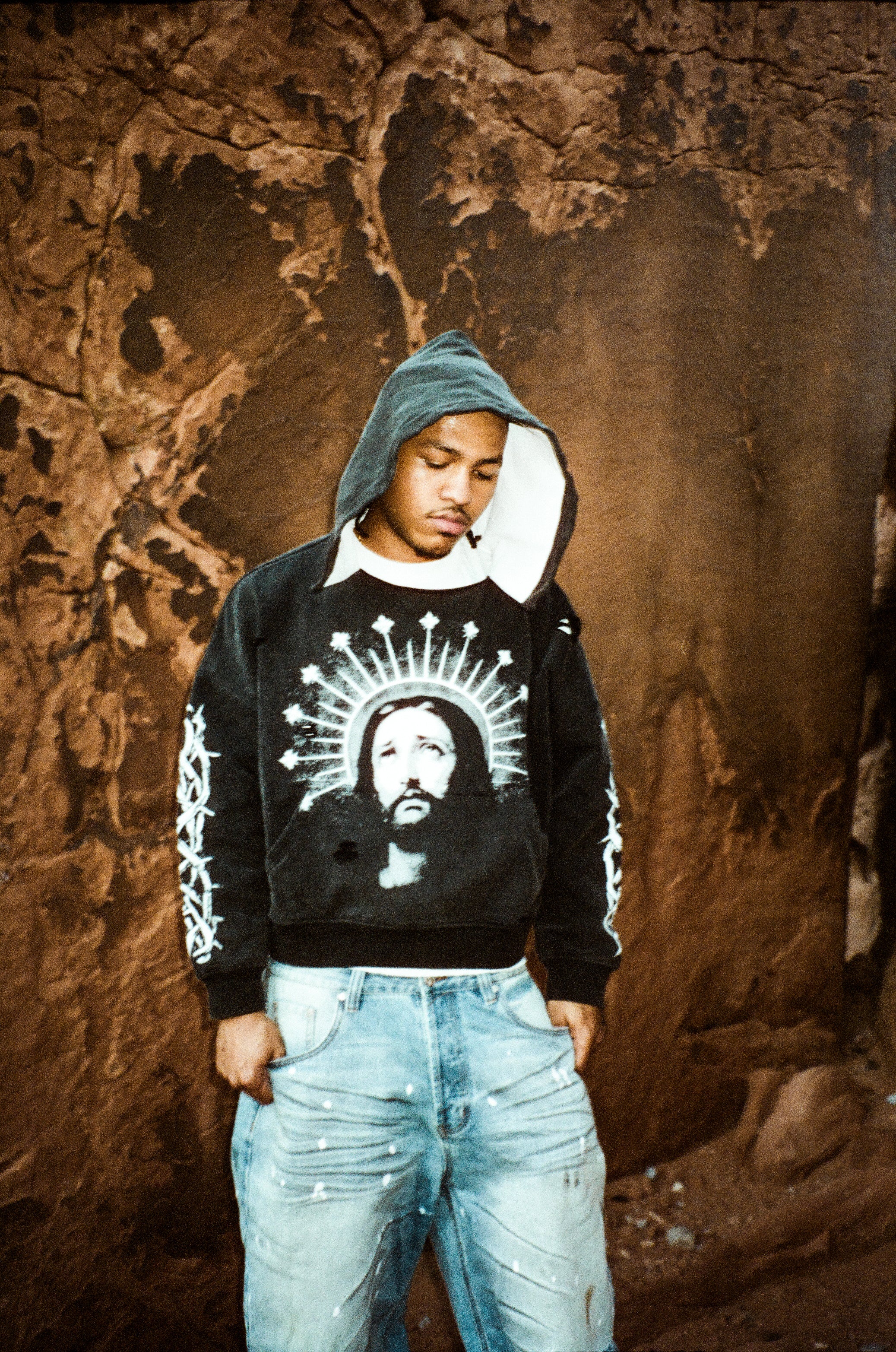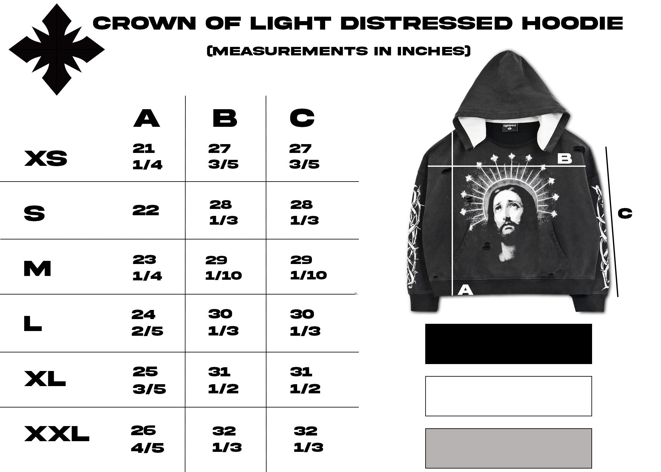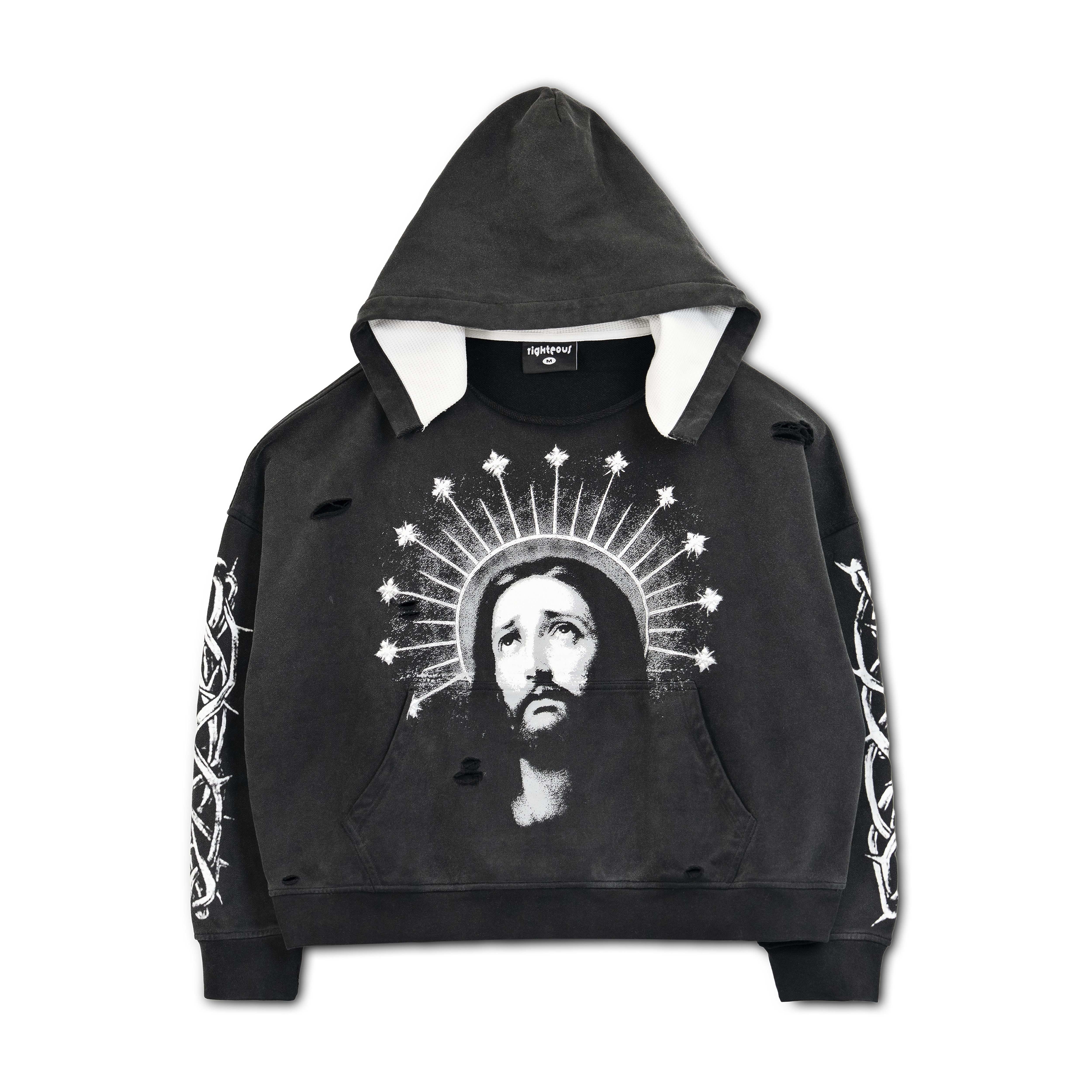 Crafted from heavyweight cotton fleece, the Crown of Light Hoodie captures the power of faith through design. Featuring a striking depiction of Jesus crowned in radiant light, framed by distressed detailing and thorns down each sleeve. The cropped, boxy silhouette and thermal lined hood add depth and structure, blending spiritual symbolism with streetwear edge.