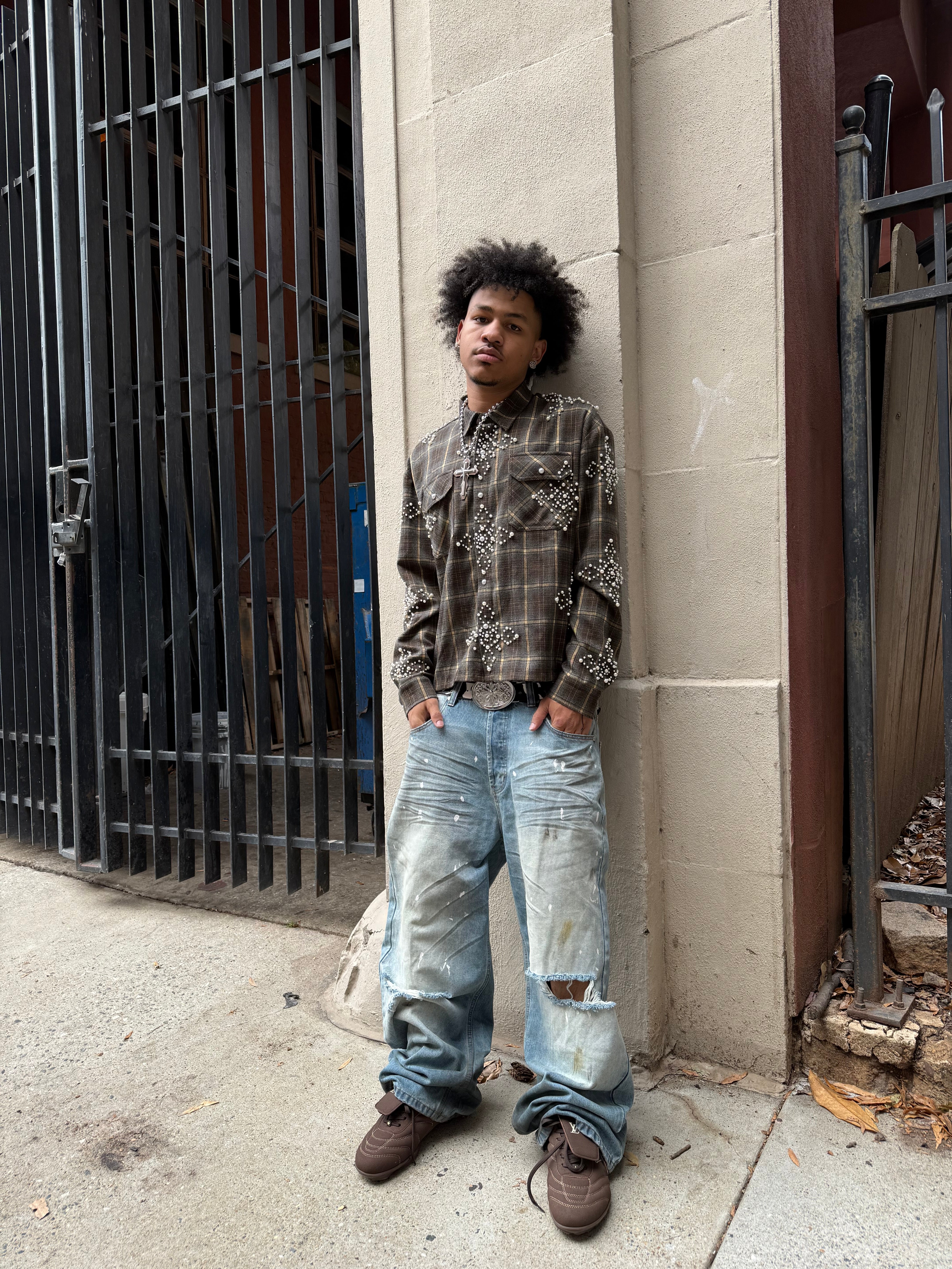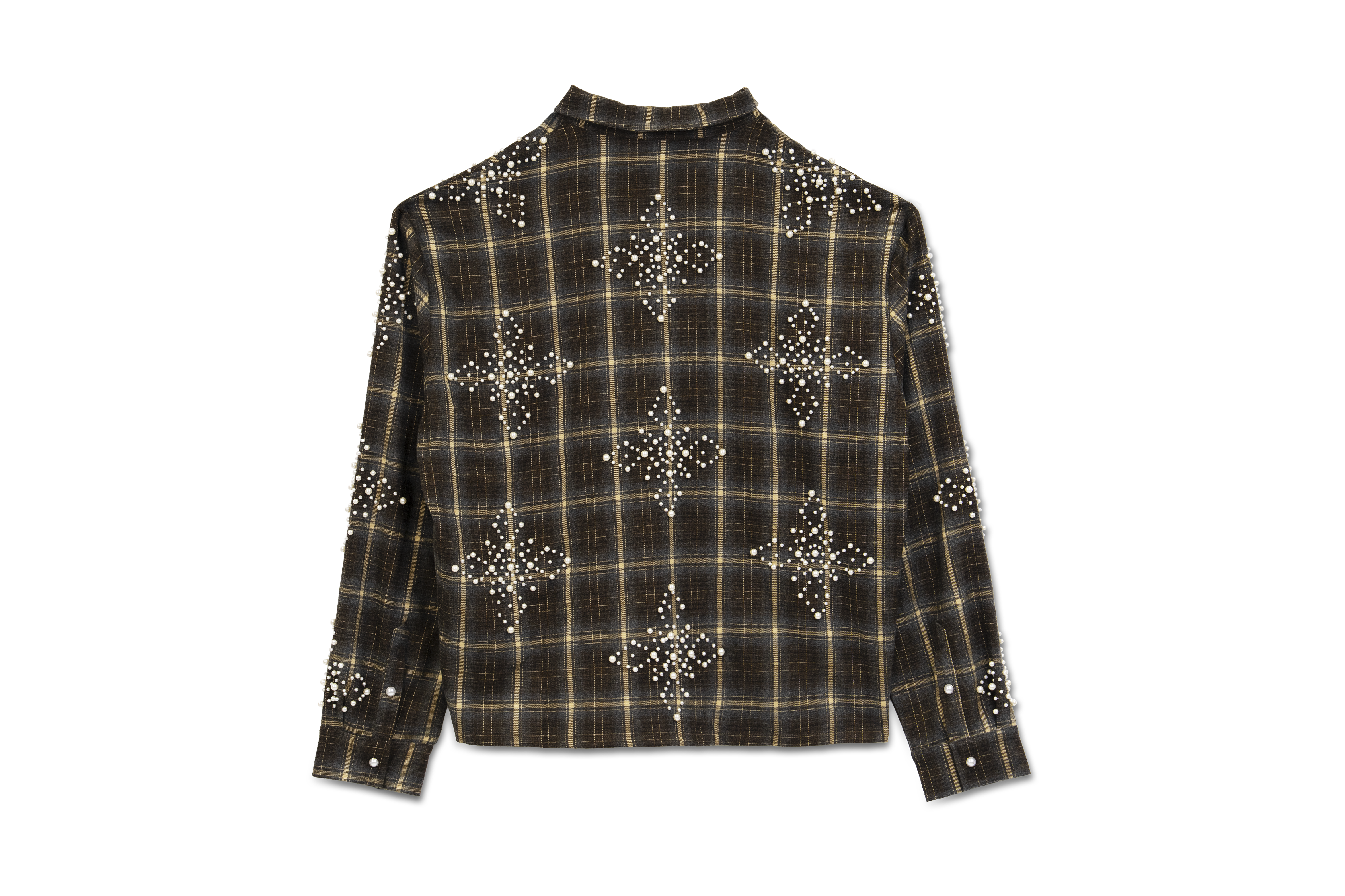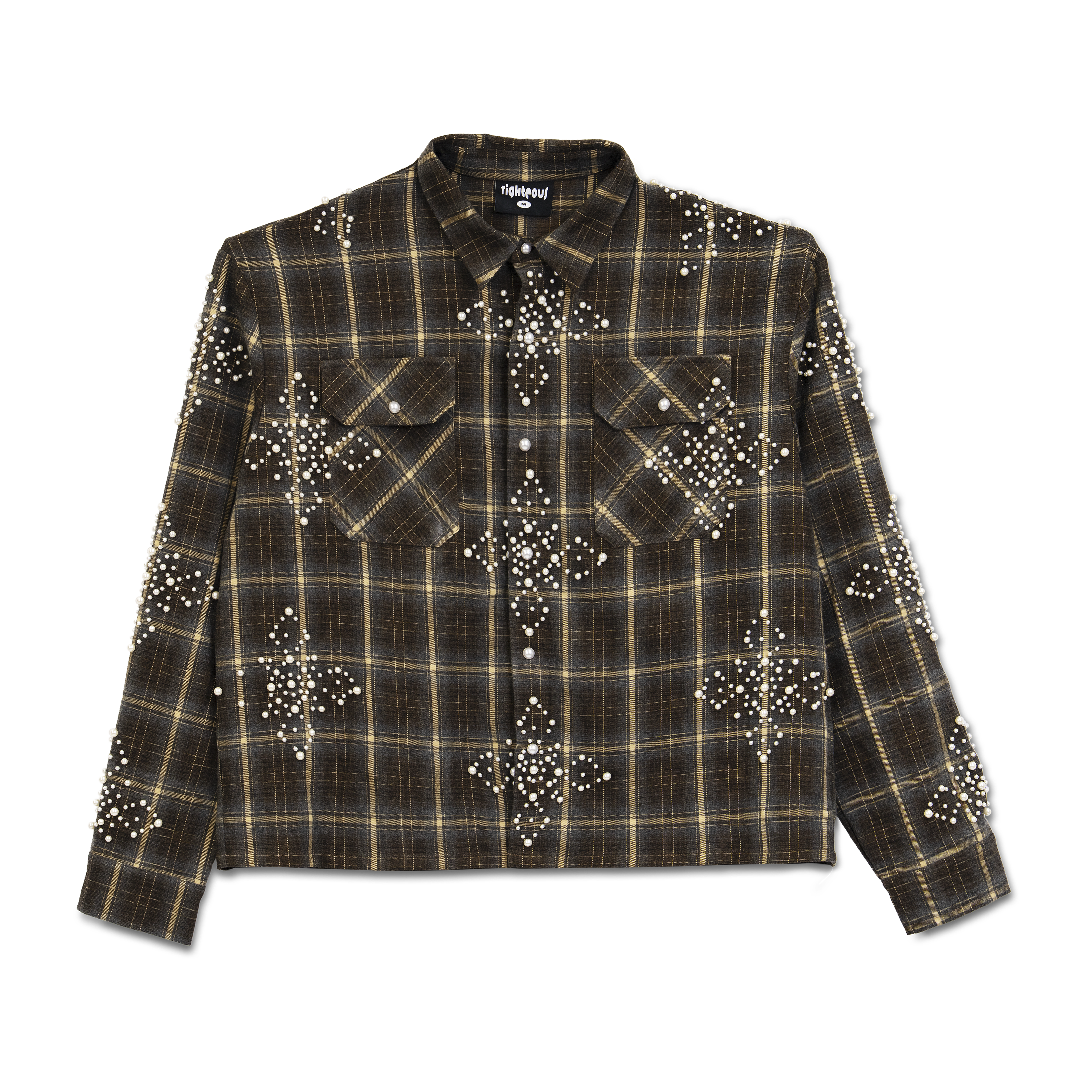 Cut from 100% cotton, the Pearl Logo Flannel blends rugged texture with refined detail. Each piece features hand-applied pearl cross embellishments throughout, creating a subtle balance of faith and edge.