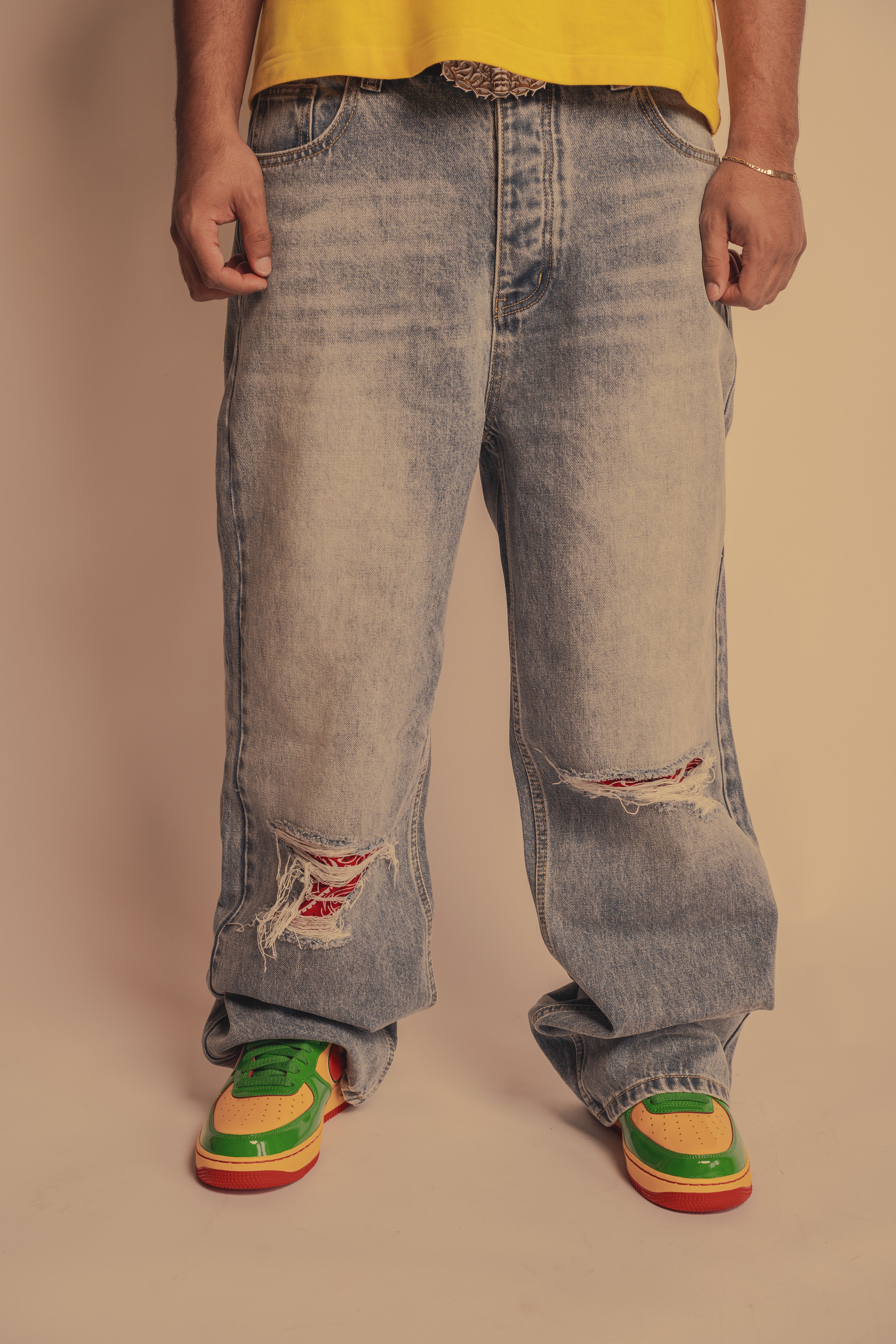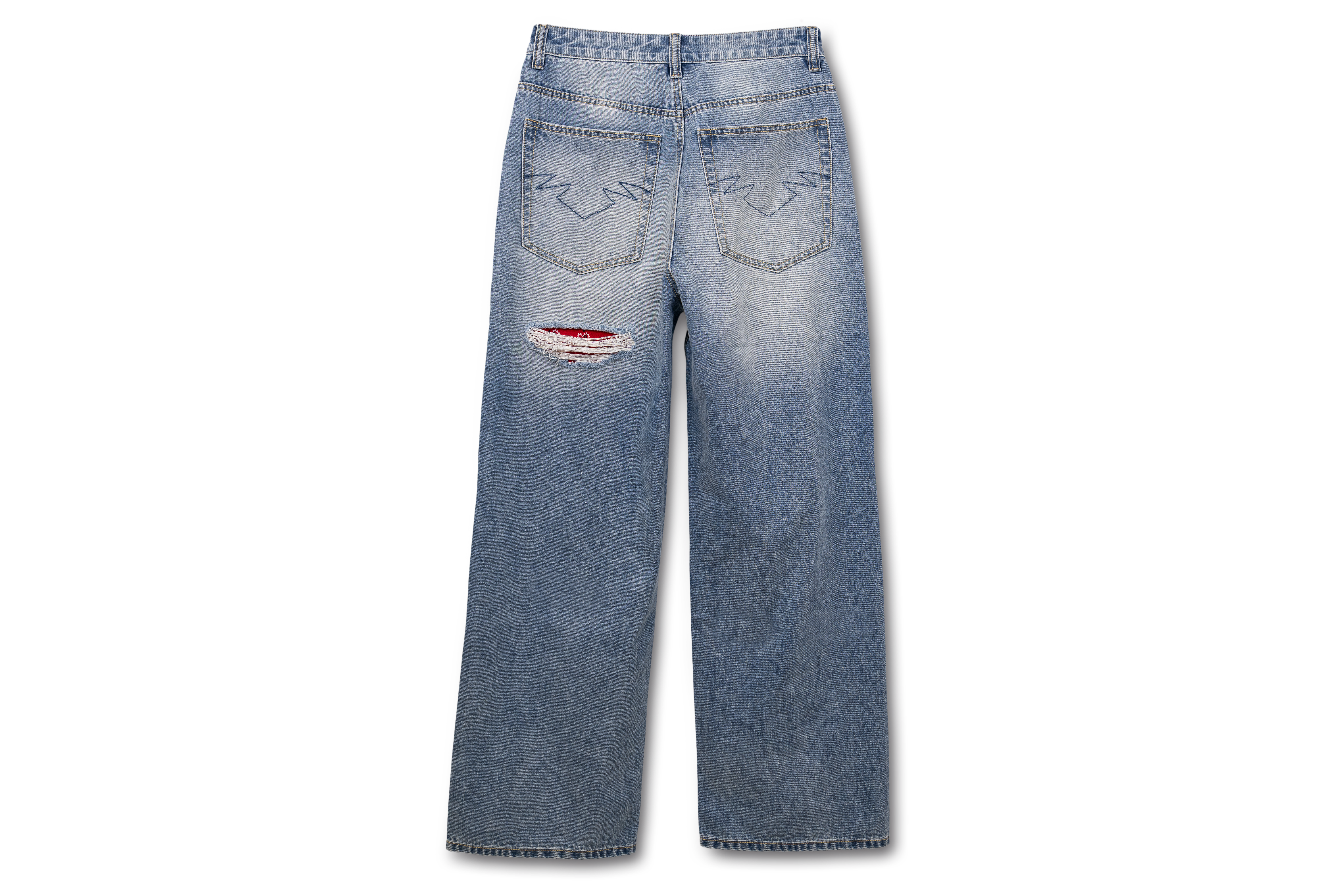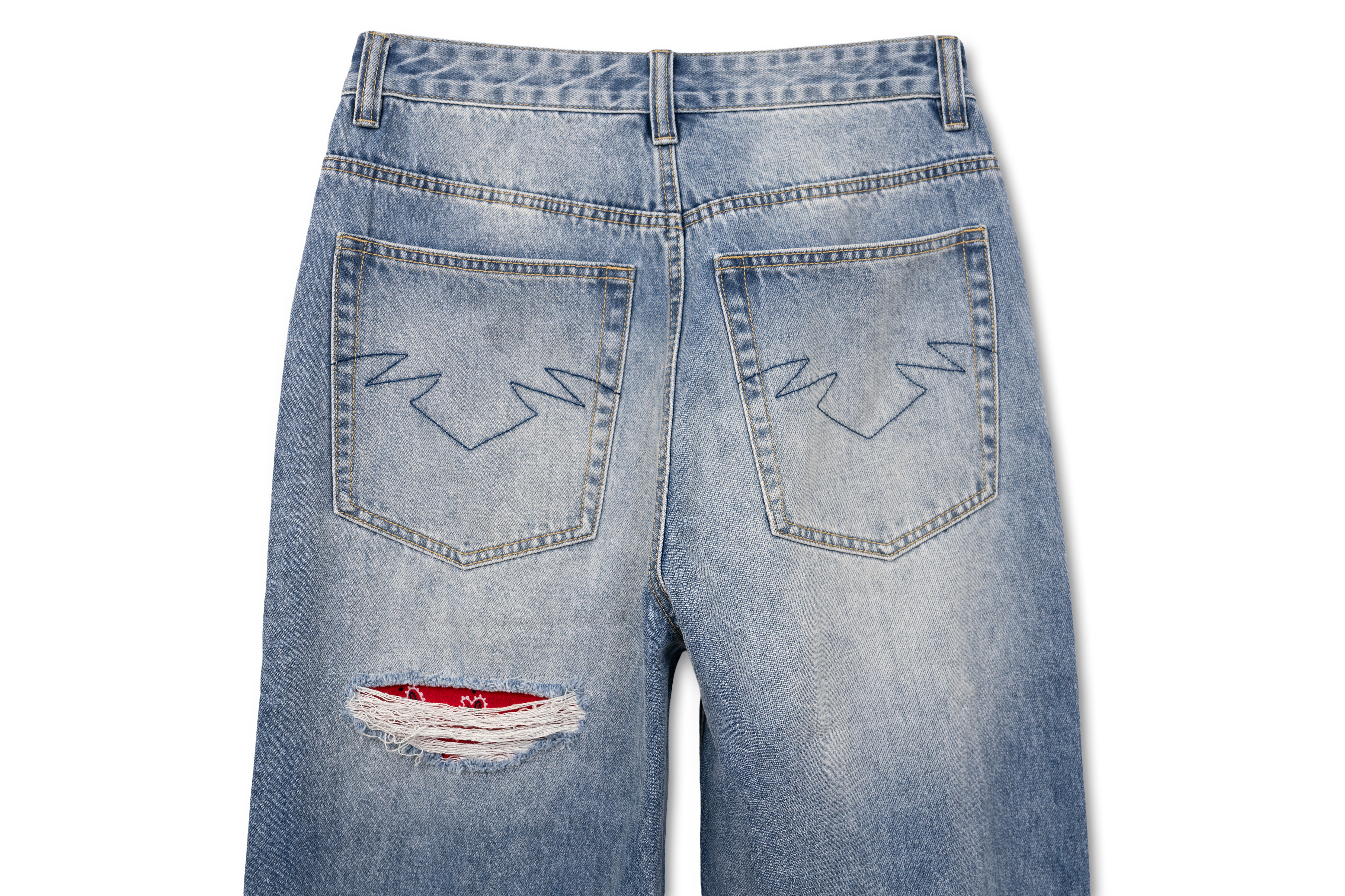 Built from heavyweight 400 GSM (14oz) denim, these jeans are crafted with layered washes and detailed distressing for an authentic worn-in look. The rips are backed with contrast paisley fabric, adding a bold twist to a classic vintage silhouette.