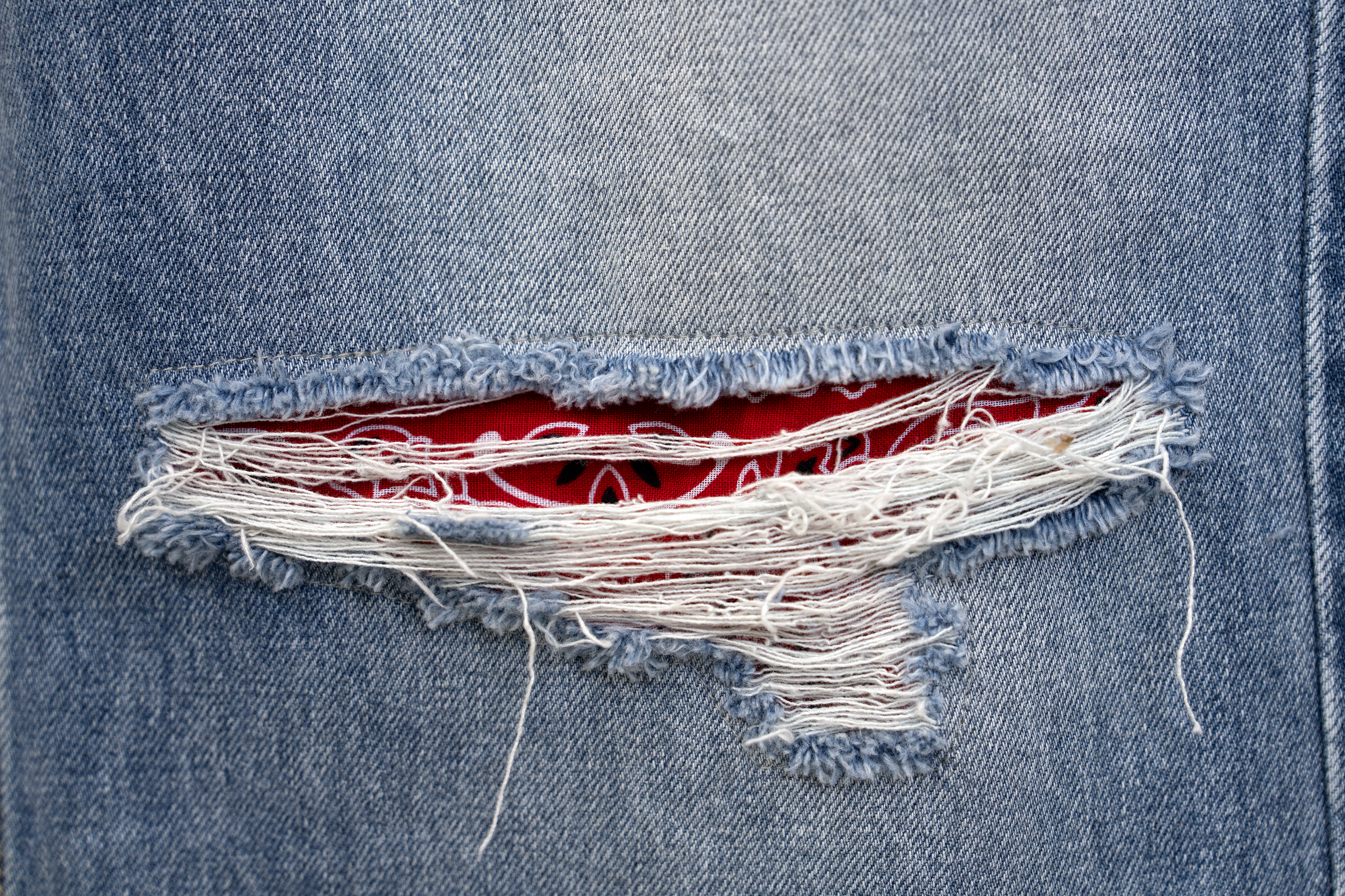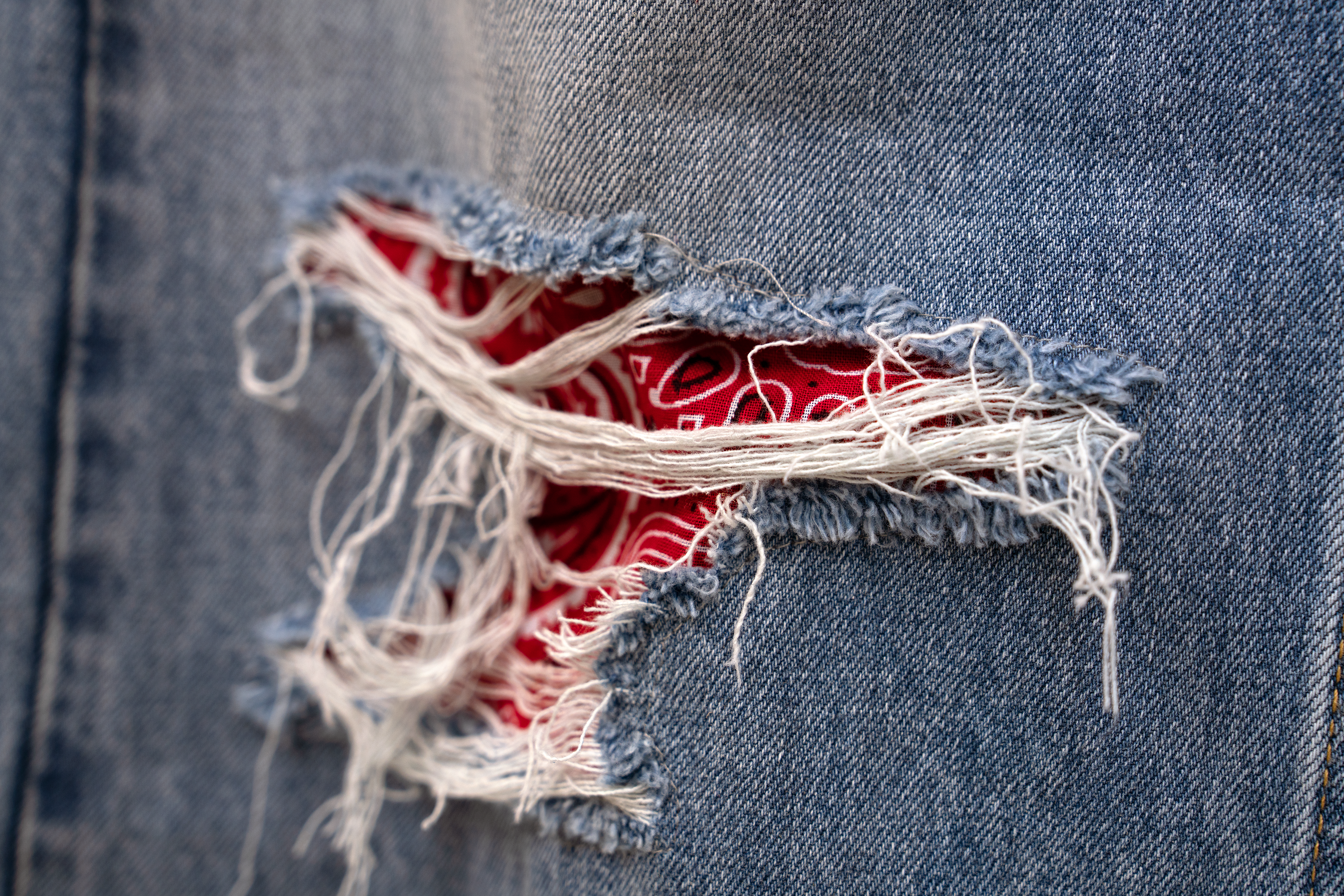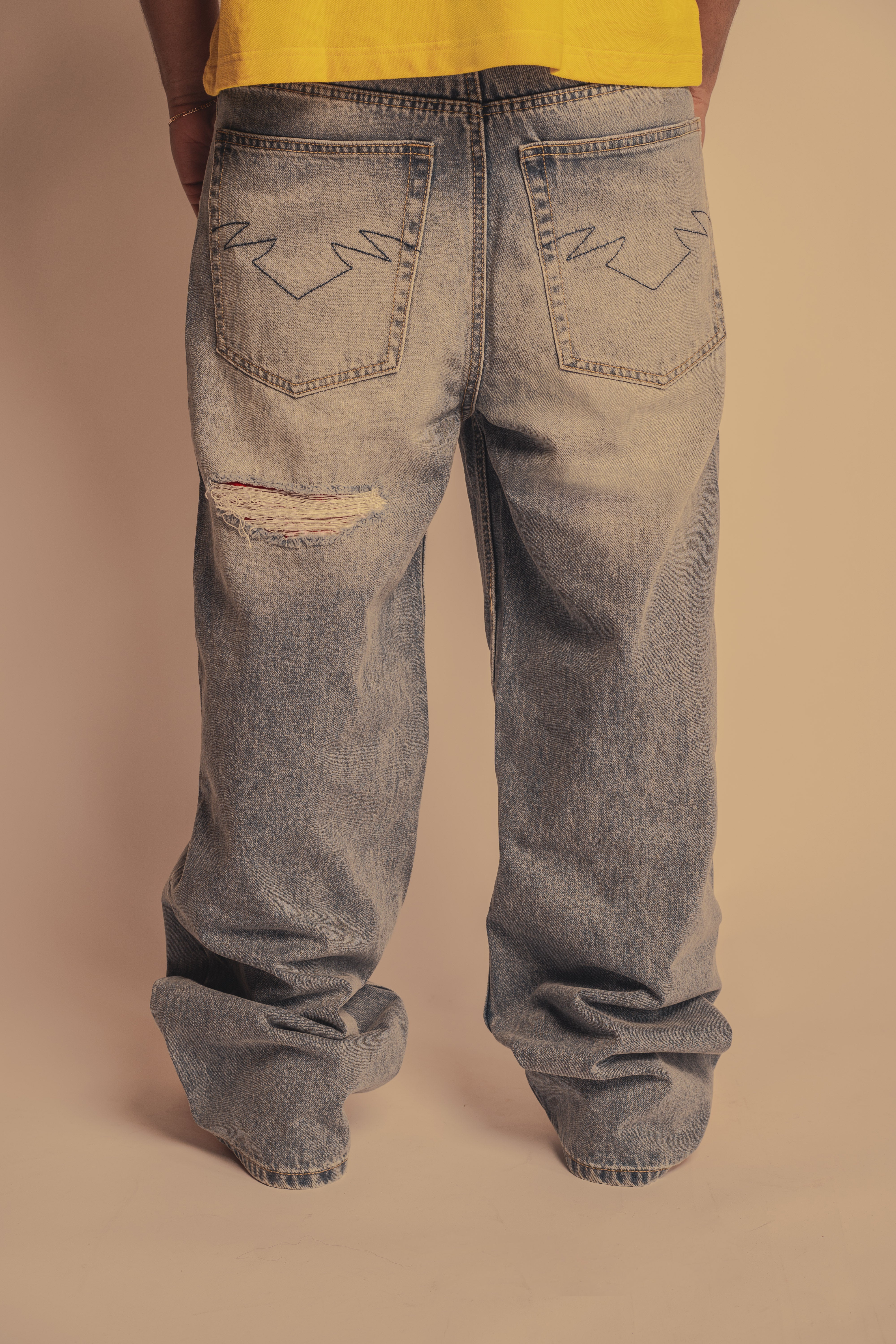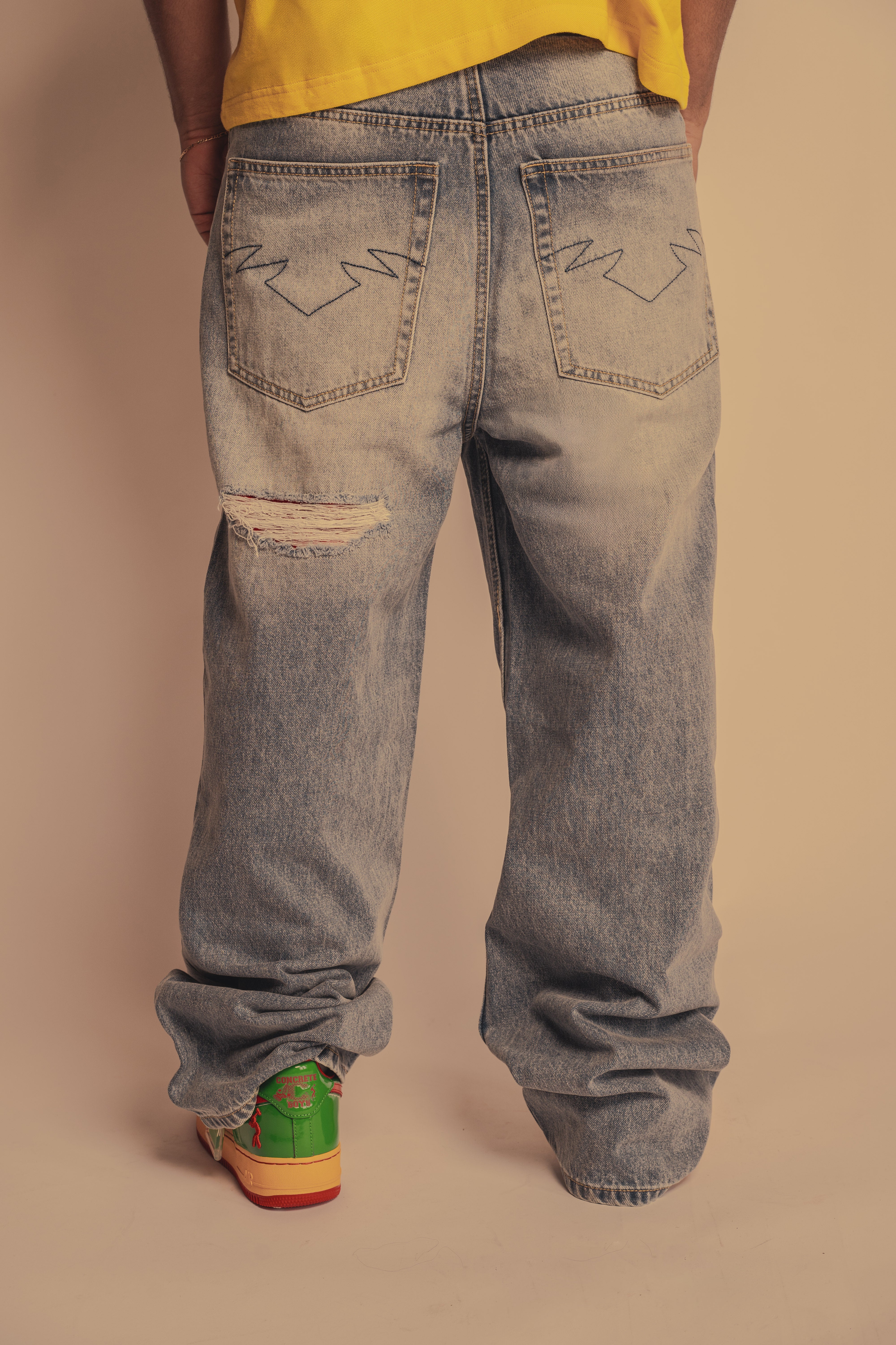 Built from heavyweight 400 GSM (14oz) denim, these jeans are crafted with layered washes and detailed distressing for an authentic worn-in look. The rips are backed with contrast paisley fabric, adding a bold twist to a classic vintage silhouette.