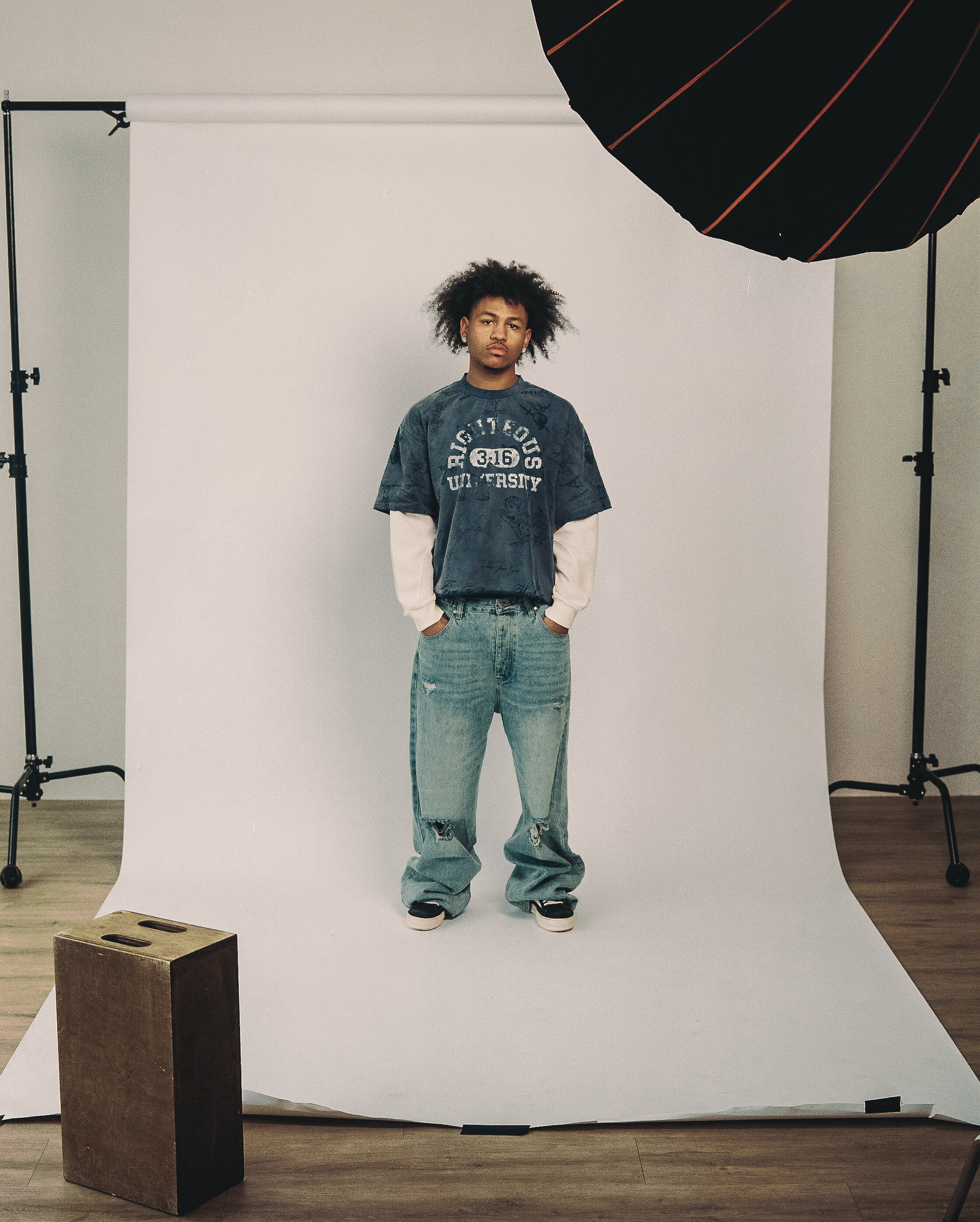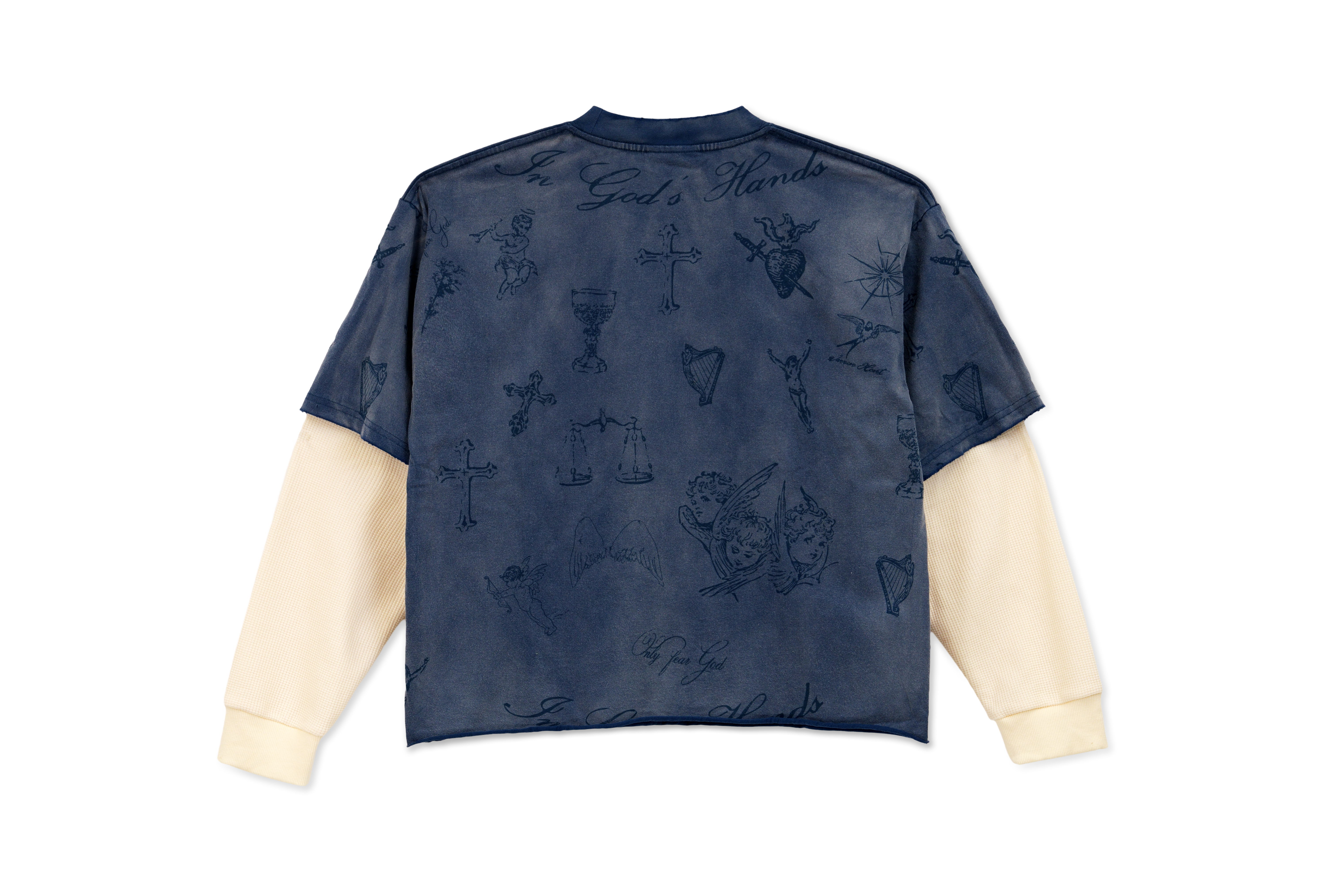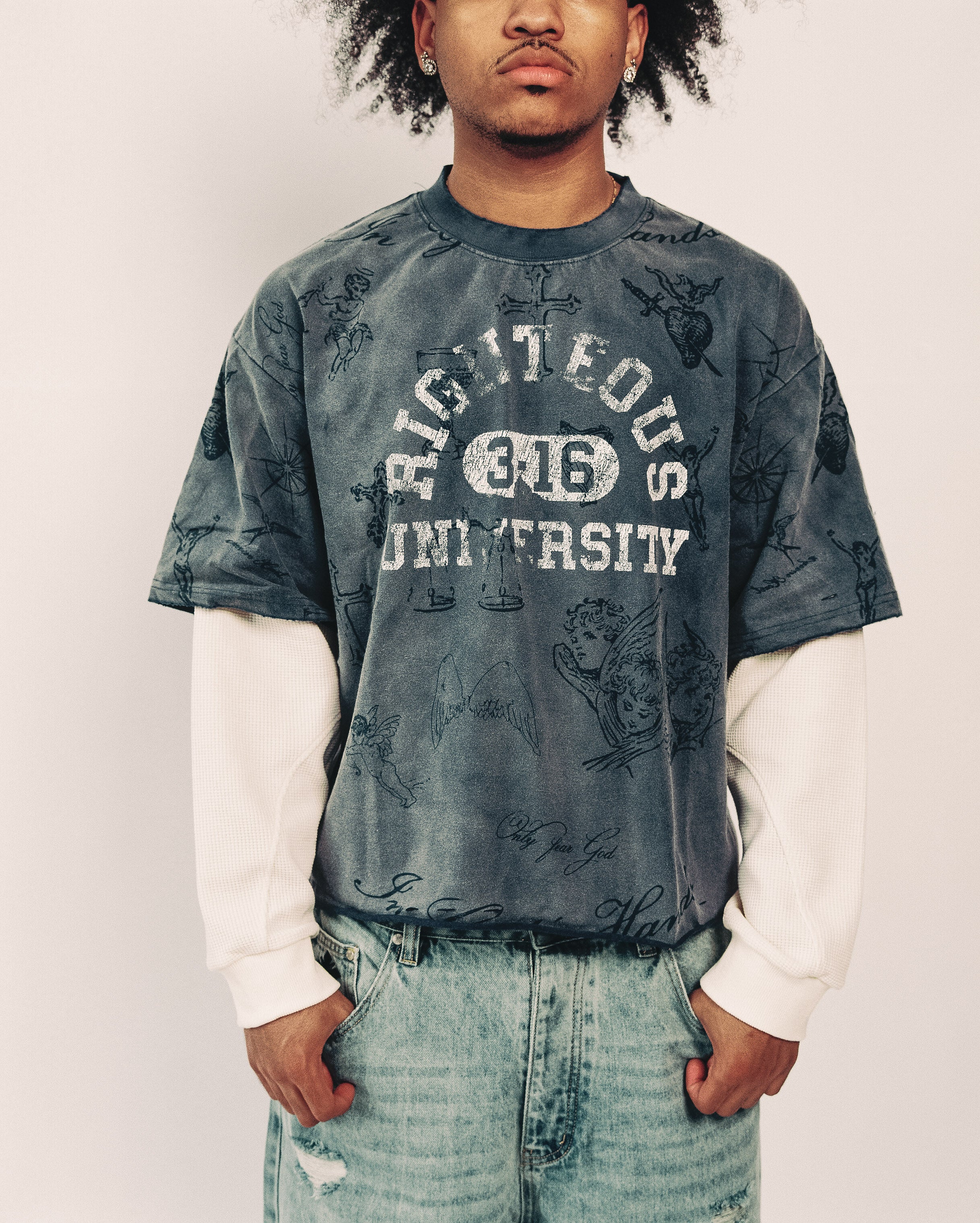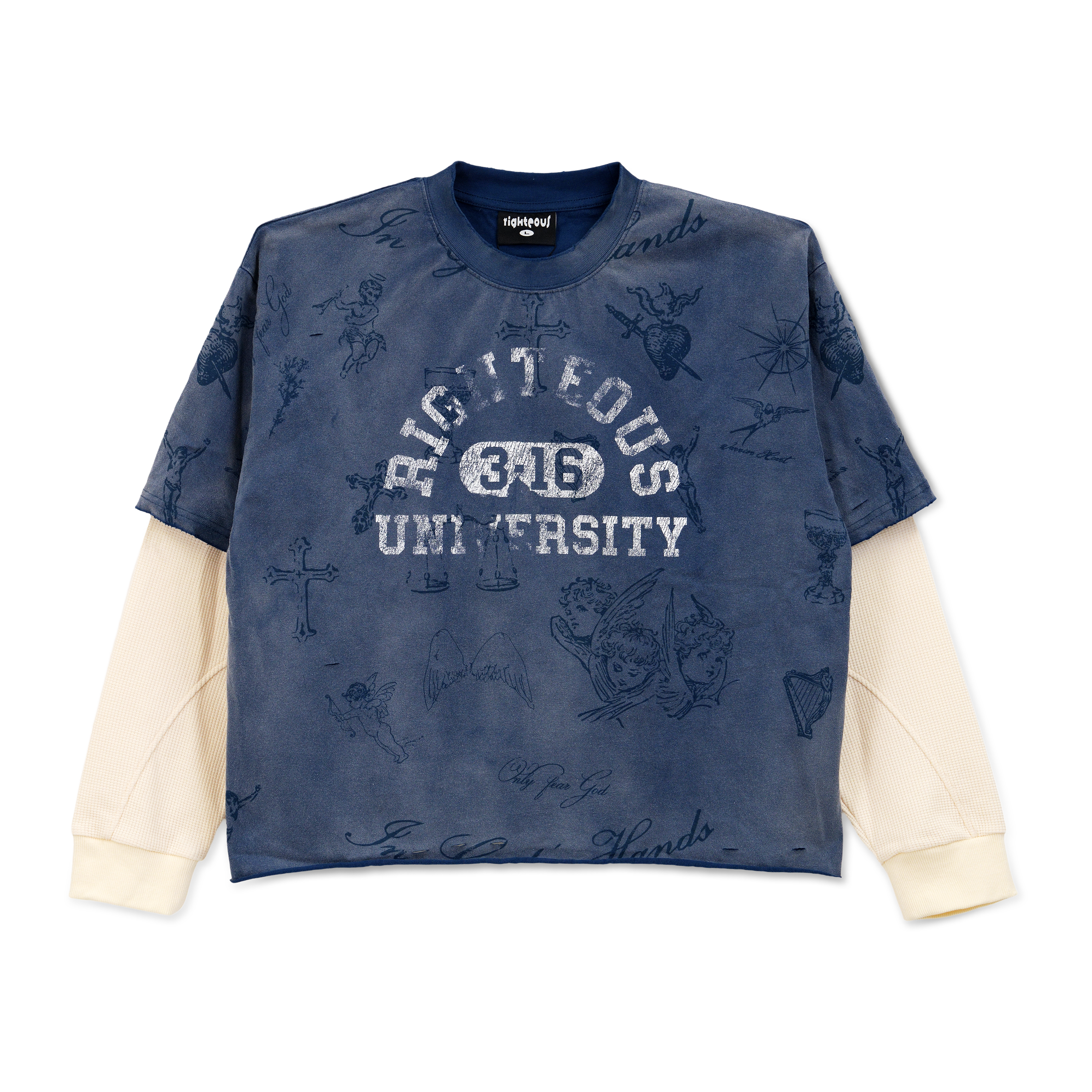 This long sleeve blends vintage edge with faith-driven design. Featuring layered thermal sleeves, an over dyed finish, and tattoo-inspired artwork of angels, crosses, and hearts, it carries bold character throughout. The chest showcases the striking Righteous University 3:16 graphic — a direct nod to John 3:16 — grounding the piece in both streetwear and scripture.