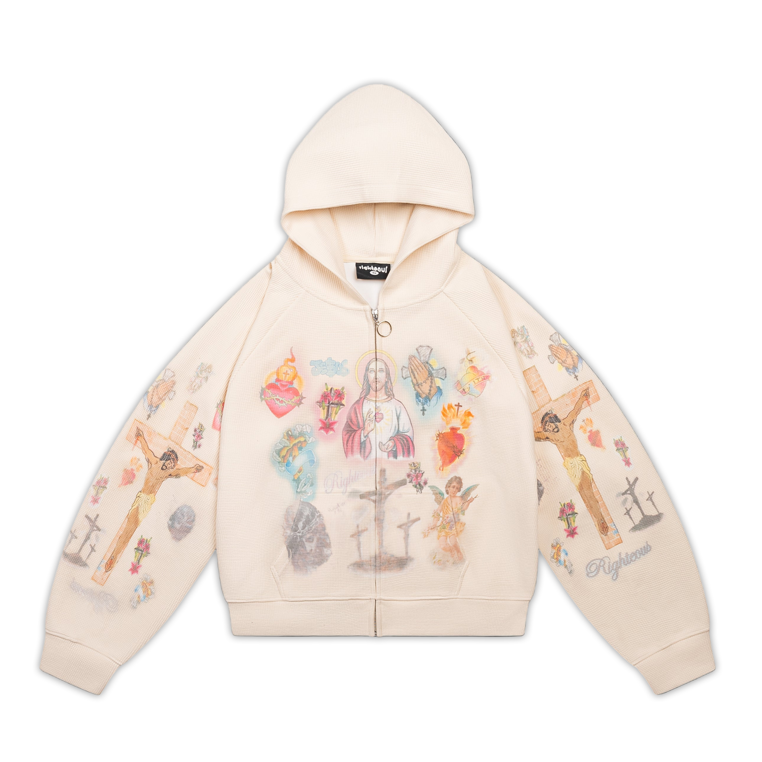 This heavyweight thermal zip-up blends premium craftsmanship with bold streetwear aesthetics, designed for those who value both comfort and meaning. Featuring double-layered 100% cotton and lined with smooth satin, this piece offers exceptional warmth without compromising style.
