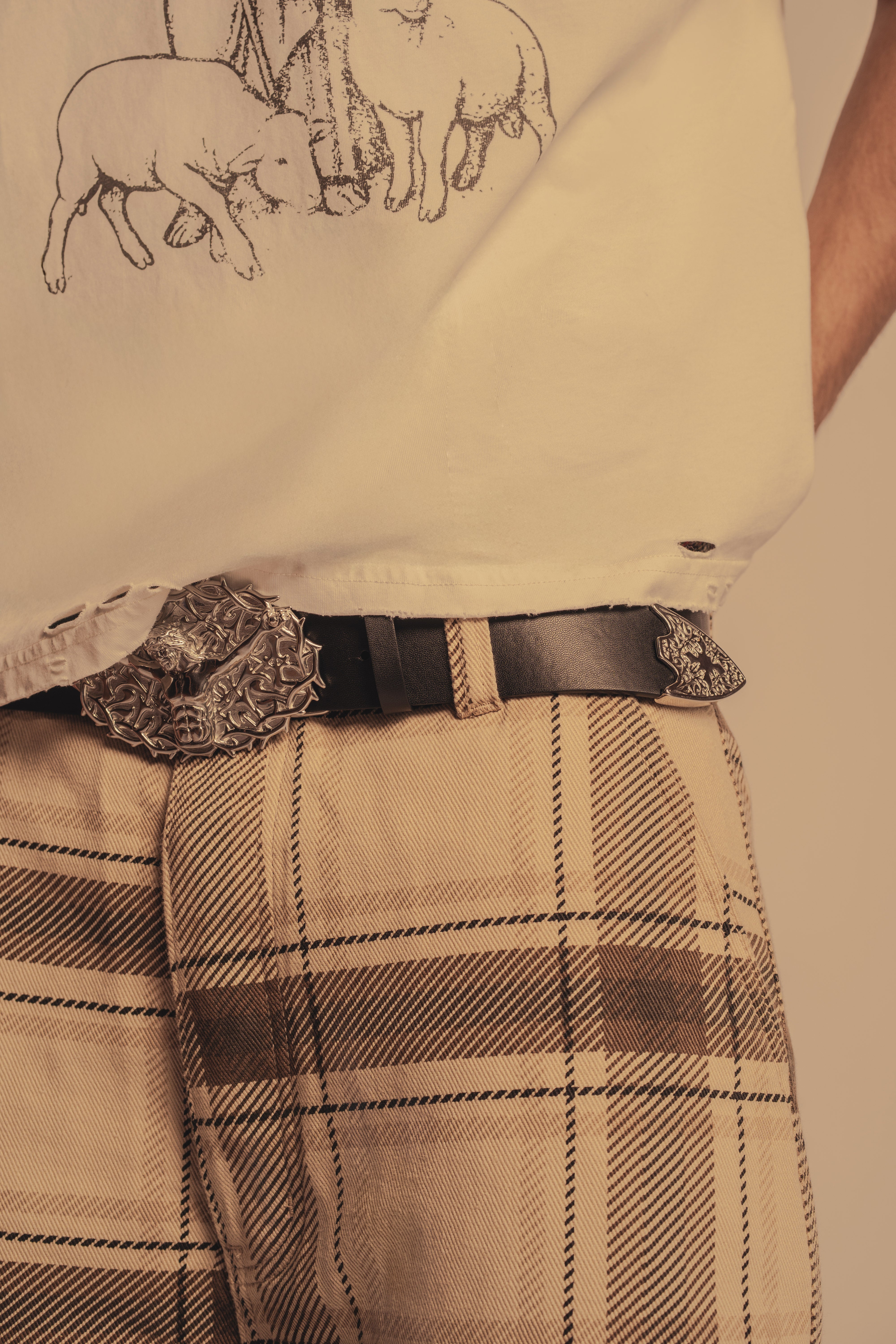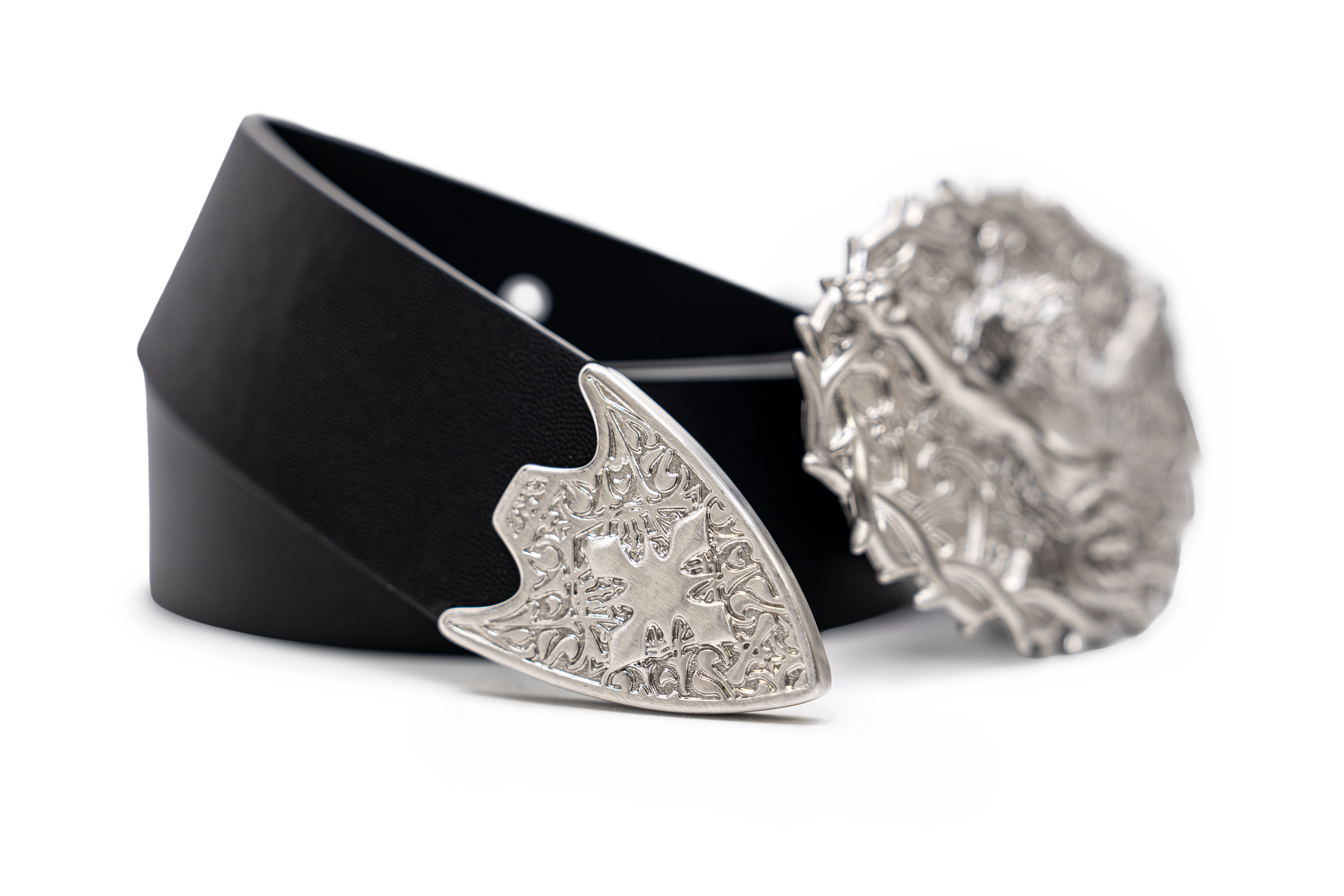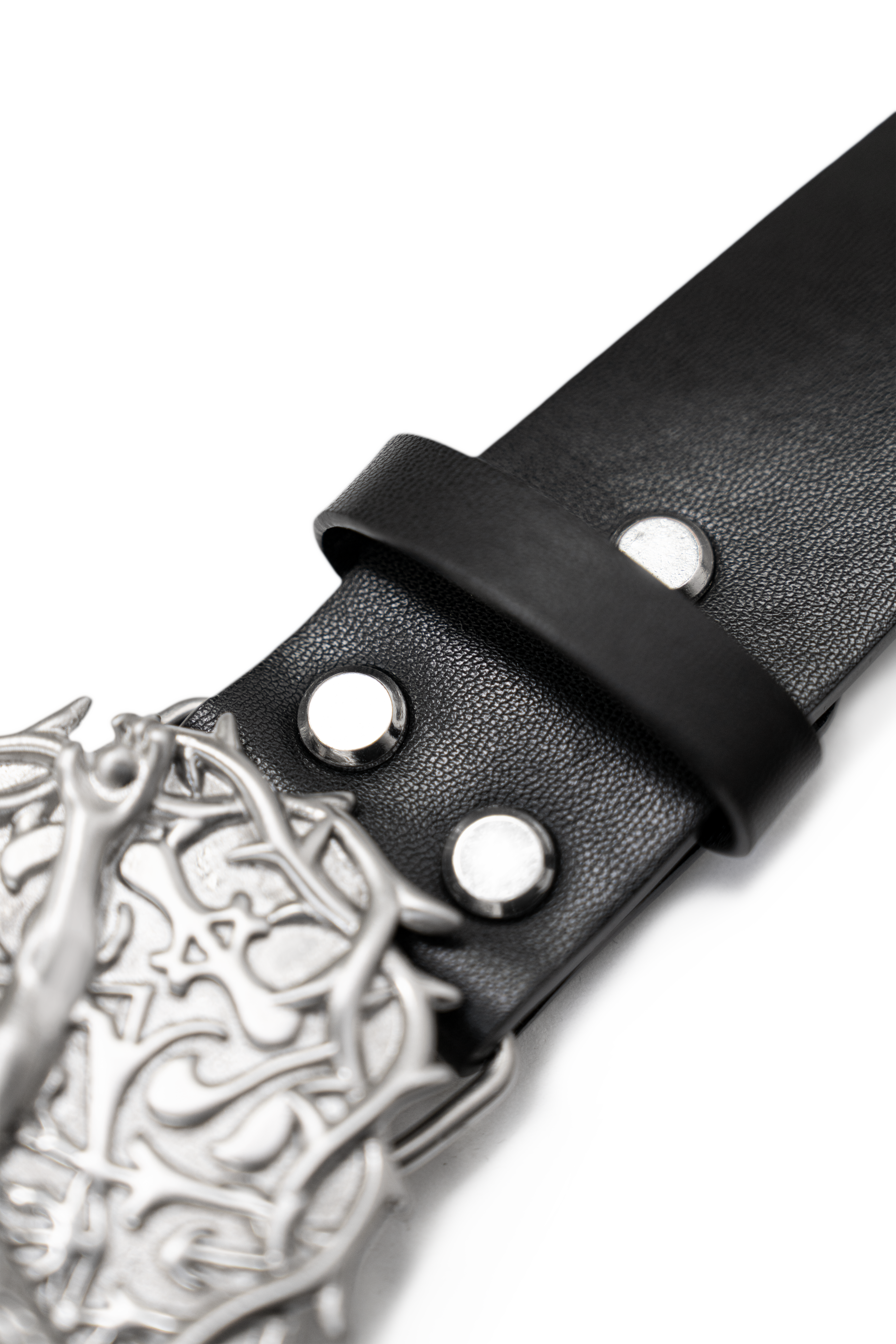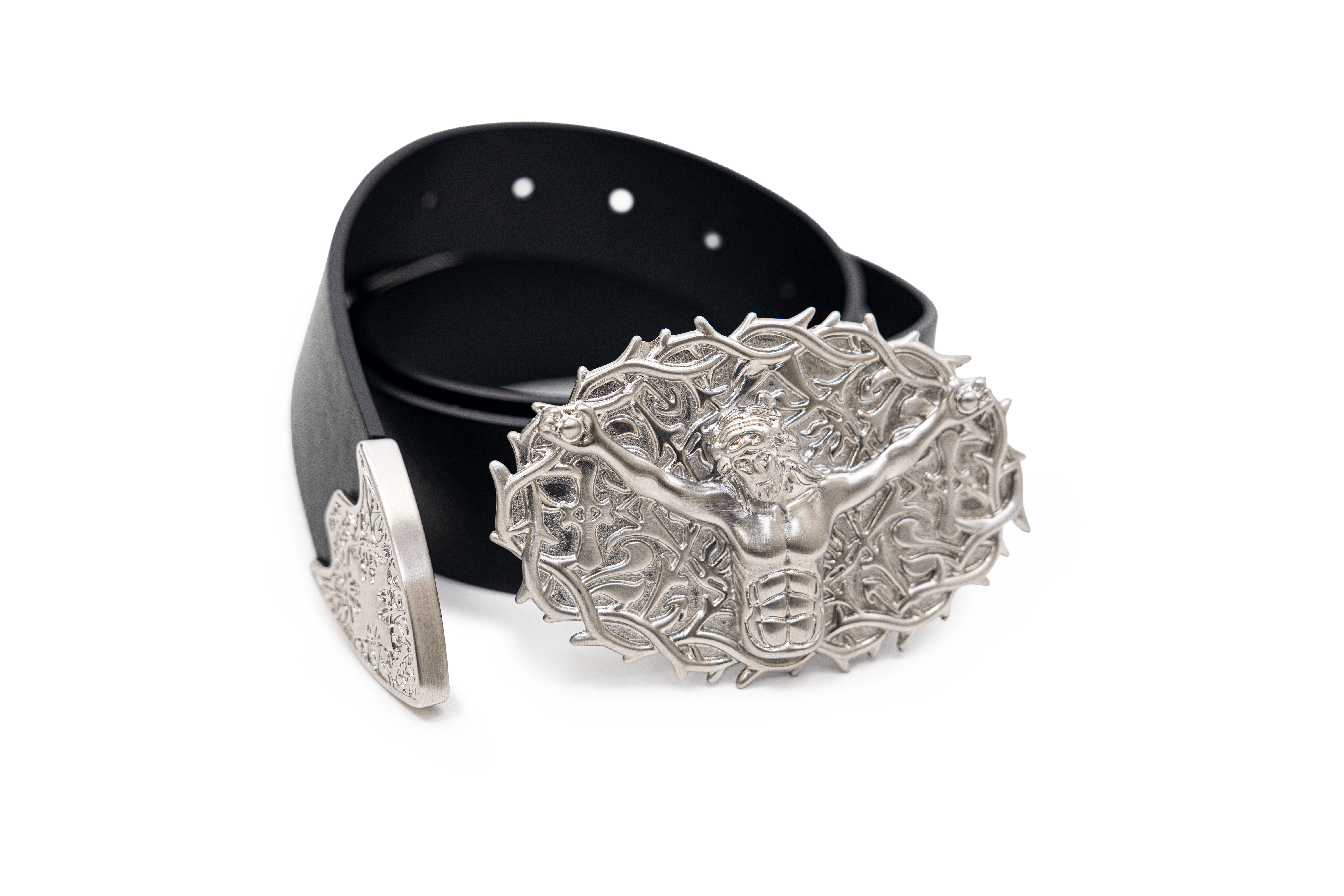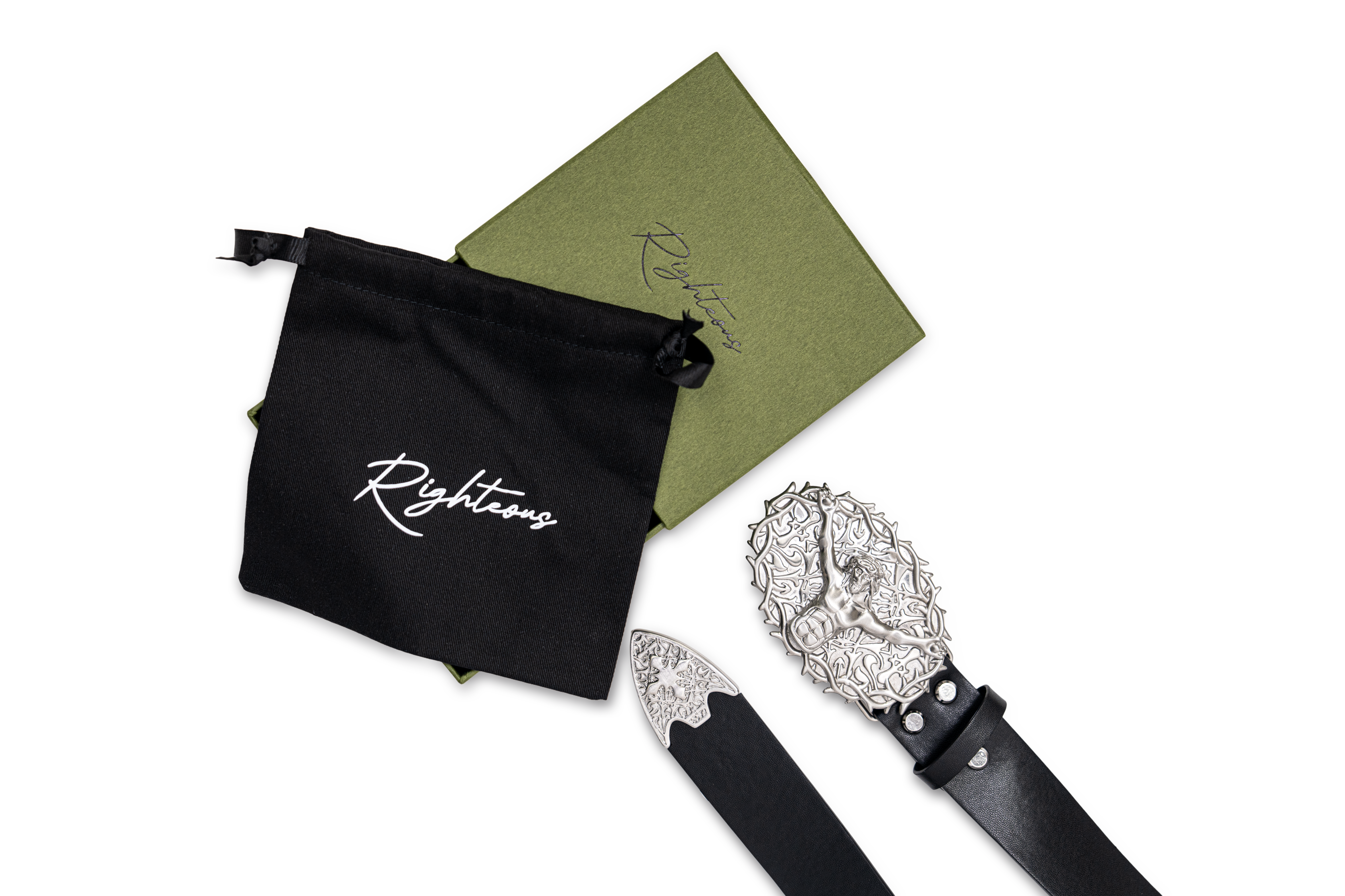 Crafted from smooth black lambskin leather, this belt features a custom solid steel buckle depicting Christ surrounded by a crown of thorns. A steel tip and custom rivets add weight and presence. Comes packaged in a Righteous dust bag with branded details throughout.