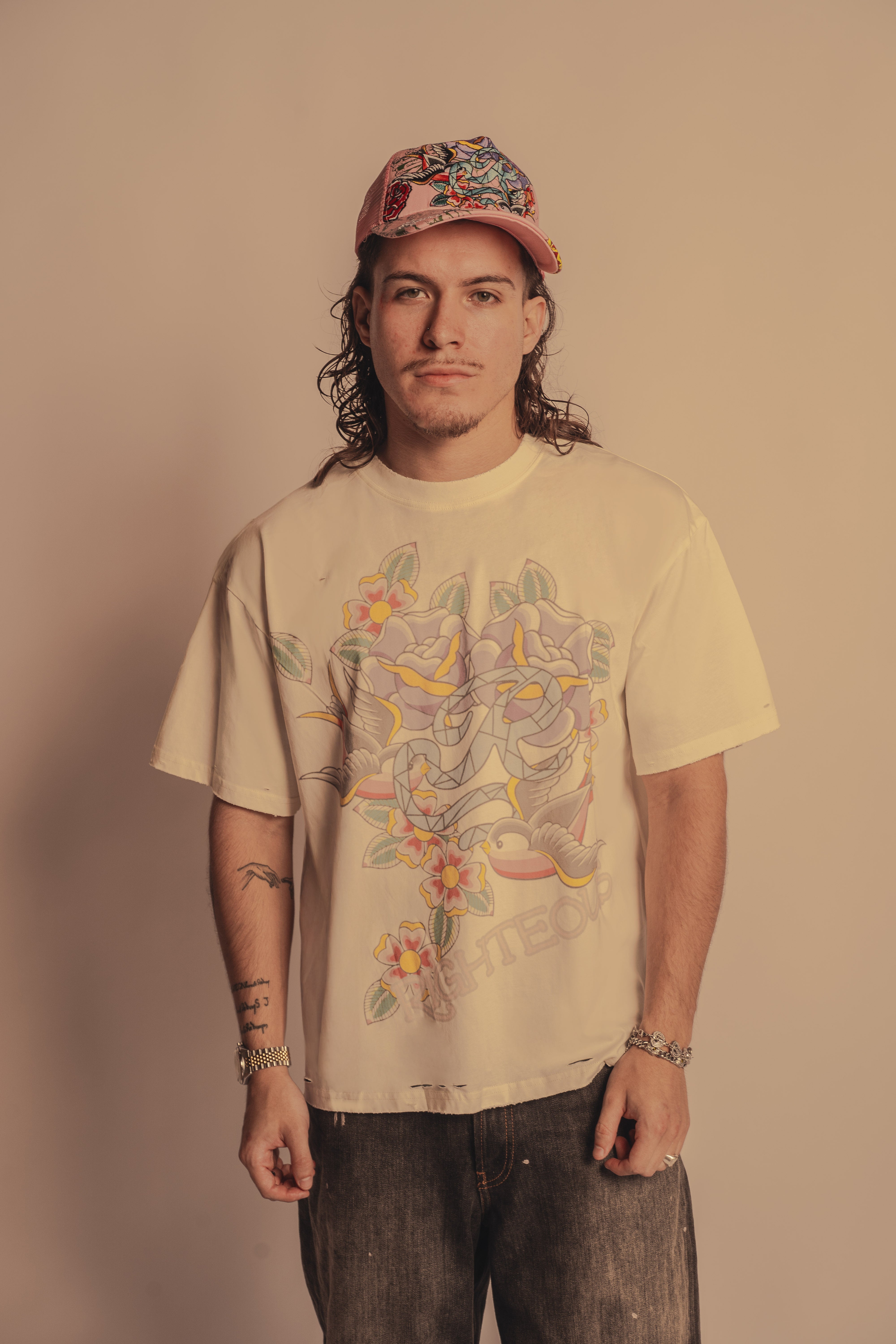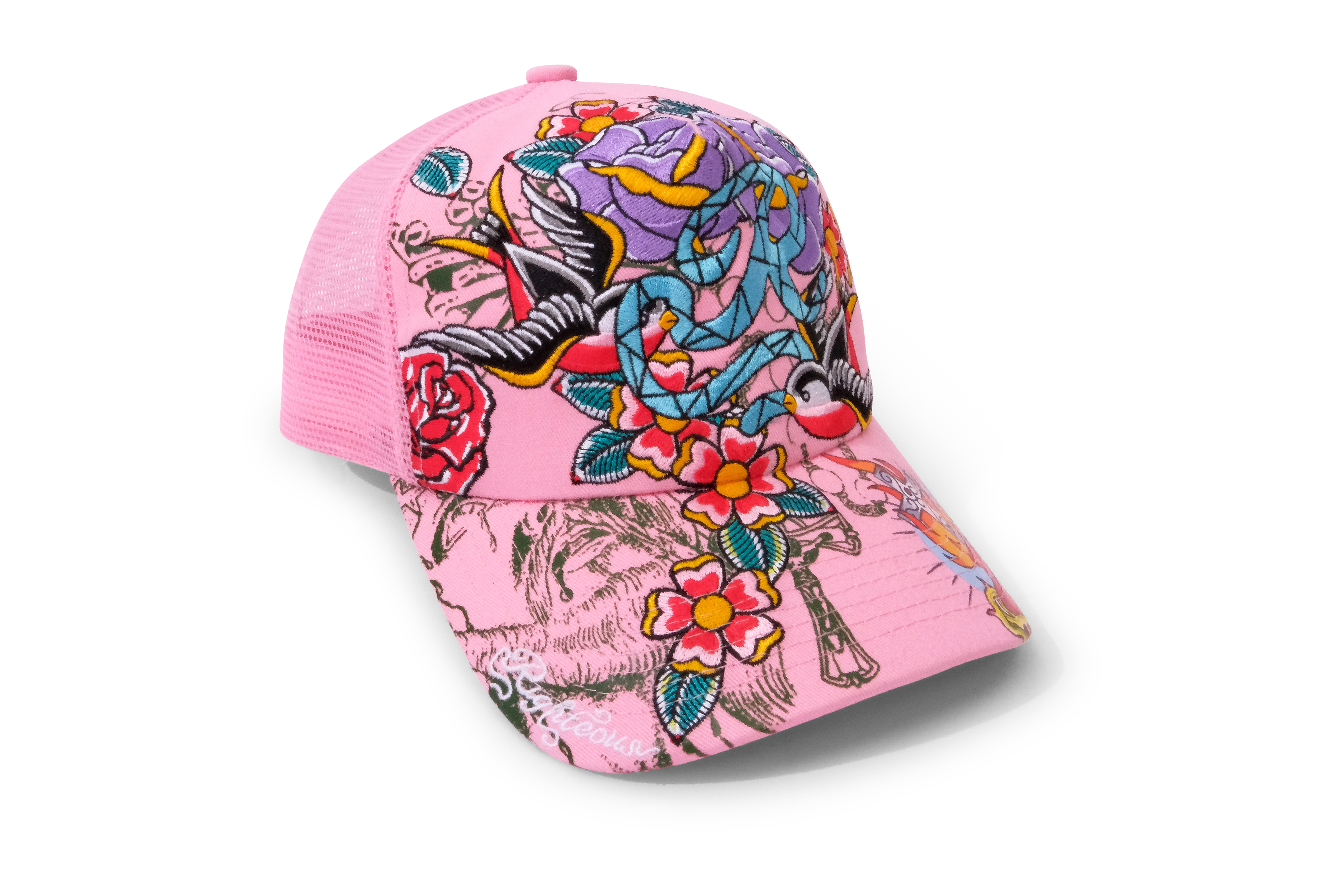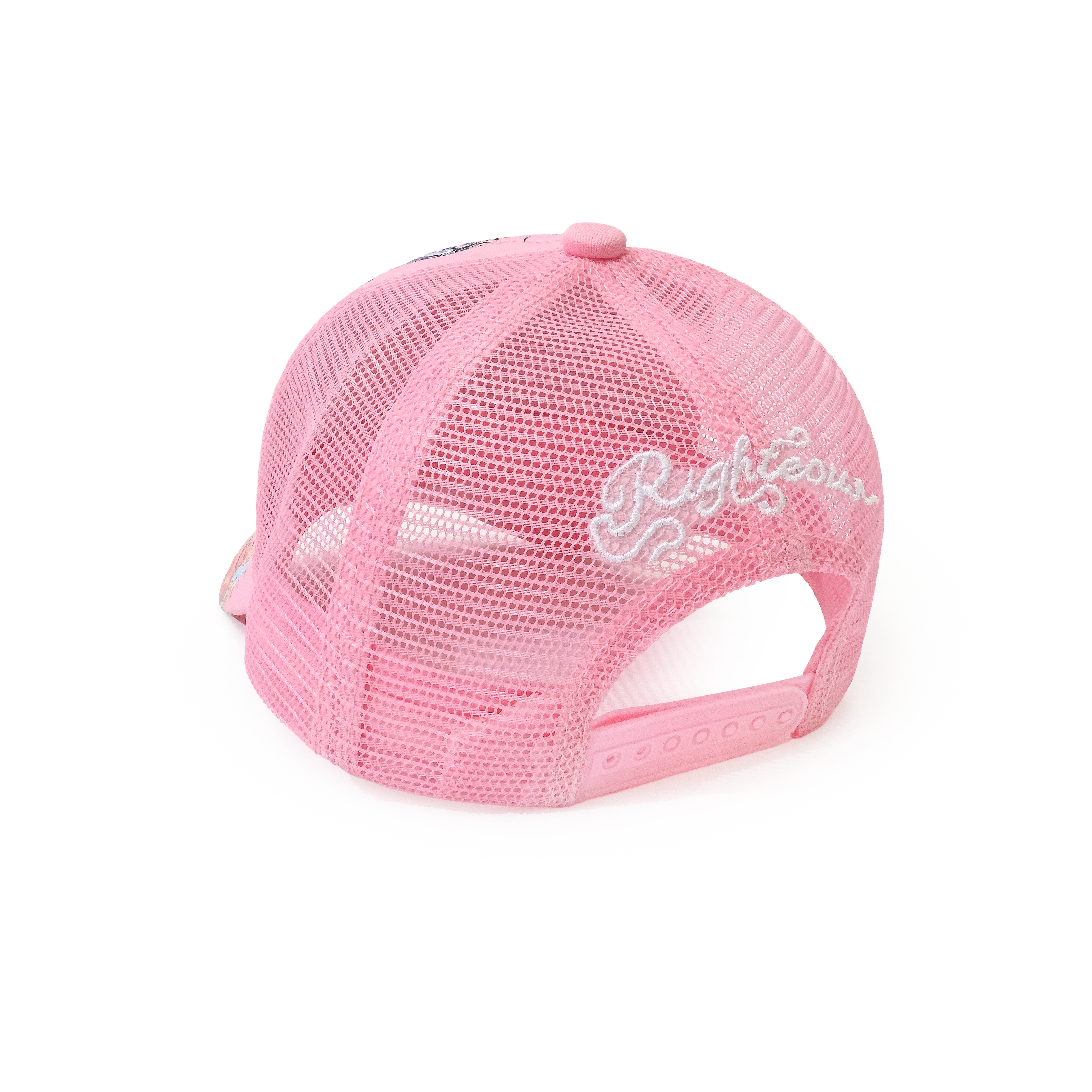 This trucker hat features a full custom graphic wrap across the front, blending tattoo-style art with bold color. The mesh back keeps it breathable, while an embroidered hit above the closure finishes it off. Built for everyday wear with a loud look.